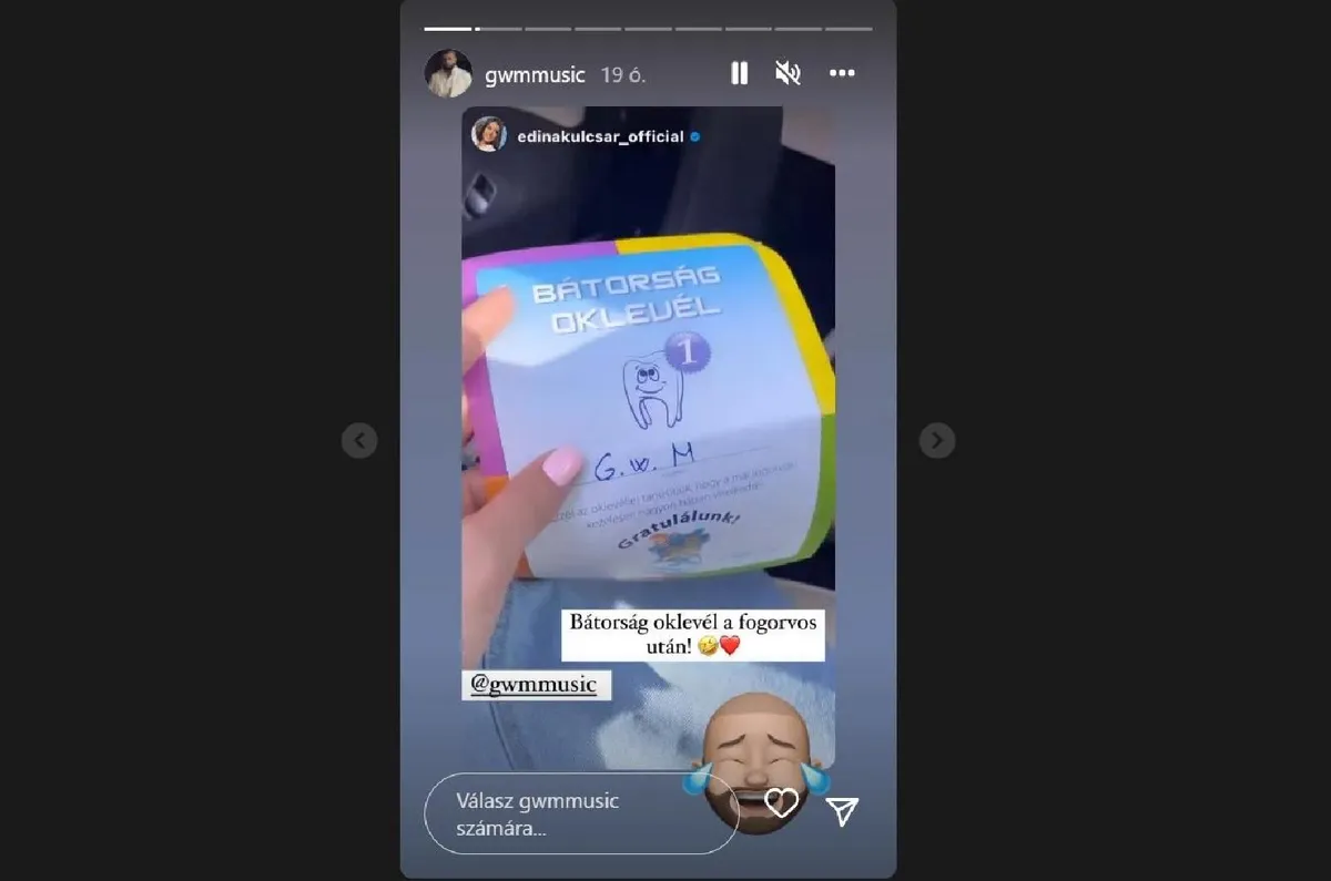Edina felfedezésén G.w.M is csak mosolyogni tudott, a talált dokumentum ugyanis egy bátorság oklevél, amit a rapper a fogorvostól kapott. Így már oklevél is bizonyítja, hogy a sztár kiállta a bátorságpróbát a fogorvosi székben. A vicces pillanatról készült videót G.w.M Instagram sztorijában mutatta meg.