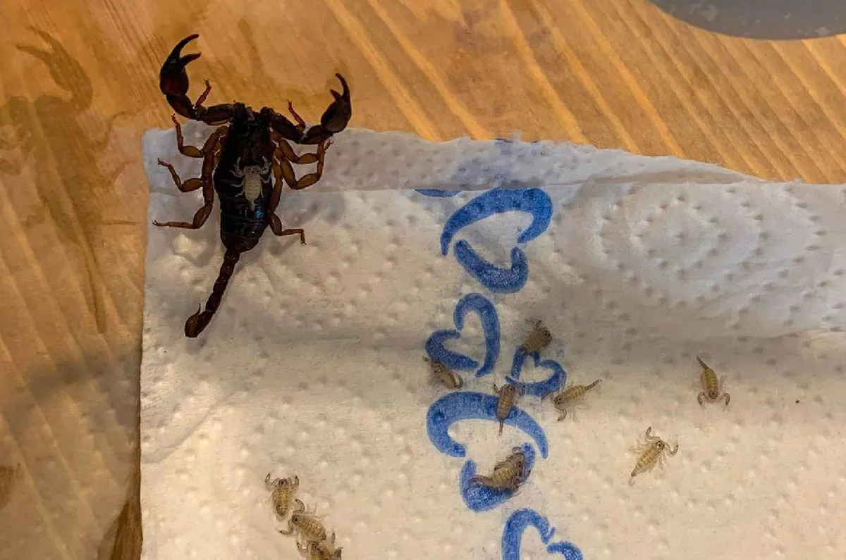 A házigazda majdnem sokkot kapott, ugyanis egy 18 tagú skorpió család tanyázott a bőröndjében. Az anyuka és 17 utódja.