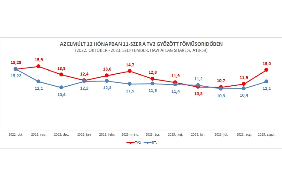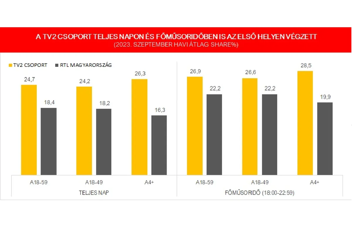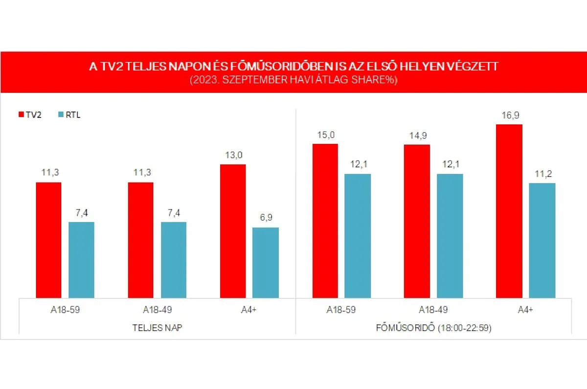 Az eltelt egy éves időszakot megvizsgálva elmondható, hogy a TV2 magabiztosan átvette a vezetést a nézettségi versenyben, és az idei őszi szezonban tovább nyílik az olló a TV2 javára a két nagy csatorna párharcában. Szeptemberben a TV2 teljes napon és főműsoridőben is toronymagasan nyerte a nézettségi versenyt mindhárom kiemelt korcsoportban. A főcsatorna kiemelkedő eredményei pedig hozzájárulnak ahhoz, hogy a TV2 Csoport is megőrizte piacvezető pozícióját a csatornacsaládok versenyében, és első helyen végzett szeptemberben mindhárom kiemelt korcsoportban.