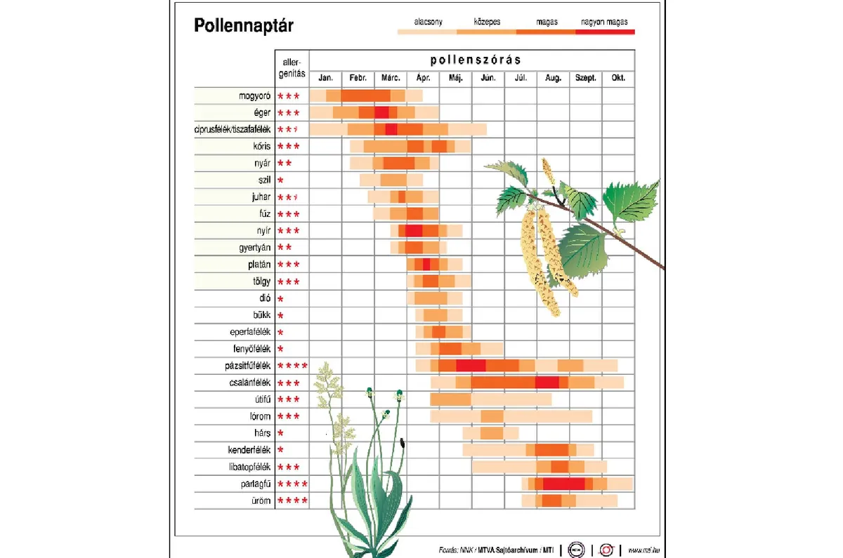 Jelenleg húszféle allergén található a levegőben, de azok közül is a platán, a nyír és az eperfa pollenkoncentrációja a legmagasabb - olvasható az MTI oldalán közzétett ábrán.