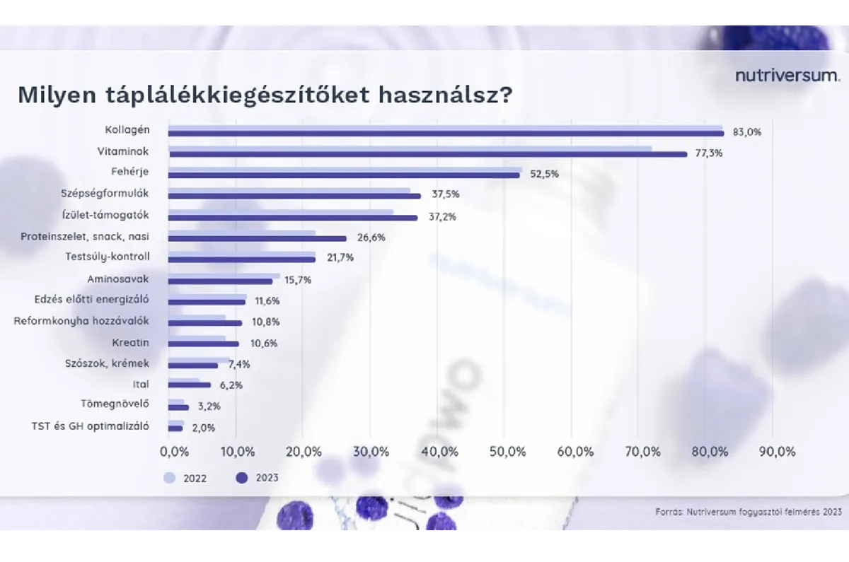 A magyar táplálékkiegészítő cég 800 fős kutatása rámutatott, hogy továbbra is a kollagén az egyik legfelkapottabb összetevő. Második helyen a vitaminok, harmadik helyen a fehérjetartalmú termékek állnak.