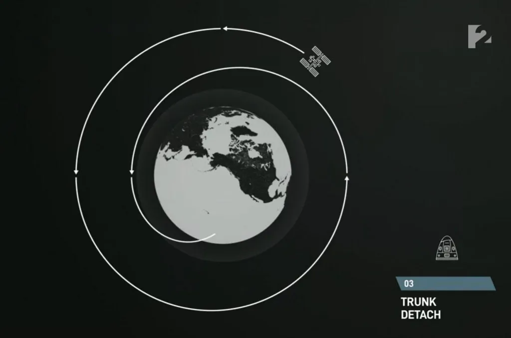 A tényleges visszatérés a pályaelhagyó manőverrel kezdődik. A Crew Dragon fő hajtóműveit a haladási iránnyal ellentétesen gyújtják be 10-15 percen át. Ez csökkenti az űrhajó sebességét annyira, hogy a Föld gravitációja "lehúzza" a légkör felé. Ezt követően már nincs visszaút, innen a kapszula megállíthatatlanul süllyed a bolygó felszíne felé.