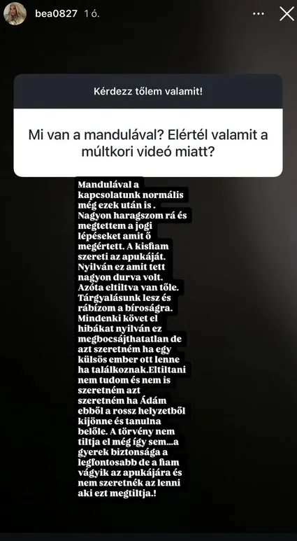 Mandulával normális a kapcsolatunk még ezek után is. Nagyon haragszom rá és megtettem a jogi lépéseket, amit ő megértett. A kisfiam szereti az apukáját. Nyilván ez, amit tett, nagyon durva volt. Azóta eltiltva van tőle. Tárgyalásunk lesz és rábízom a bíróságra. Mindenki követ el hibákat, nyilván ez megbocsájthatatlan, de azt szeretném, ha egy külsős ember ott lenne, ha találkozunk. Eltiltani nem tudom és nem is szeretném, azt szeretném, ha Ádám ebből a rossz helyzetből kijönne és tanulna belőle. A törvény nem tiltja el még így sem…A gyerek biztonsága a legfontosabb, de a fiam vágyik az apukájára és nem szeretnék az lenni, aki ezt megtiltja