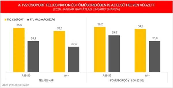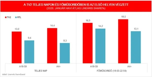 A sikeres őszi tévés főszezont folytatva, 2026 januárjában is a TV2 lett a legnézettebb csatorna teljes napon és főműsoridőben egyaránt, mindkét kiemelt korcsoportban.