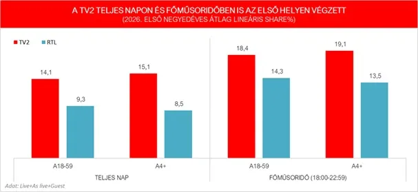 2026 első negyedévében a TV2 saját gyártású műsorainak sikerétől volt hangos a magyar tévés piac. A Kincsvadászok, A Nagy Ő – The Bachelor, Séfek séfe, A Nagy Duett és az Exatlon Hungary kimagasló nézettségi eredményeinek köszönhetően a TV2 1998 óta a legnagyobb első negyedéves előnyét szerezte meg idén legfőbb versenytársával szemben, főműsoridőben, a fő kereskedelmi célcsoportban.*