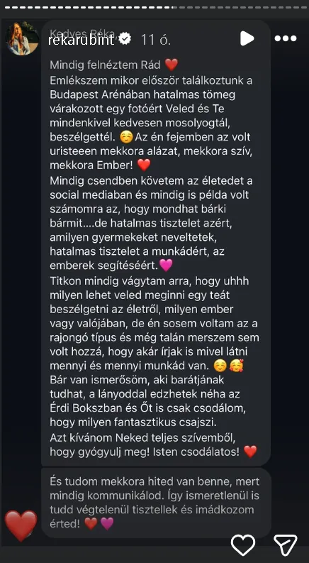 Az üzenet írója felidézte azt az alkalmat, amikor először nyílt lehetősége találkozni a fitneszladyvel a Budapest Arénában. Hatalmas tömeg várakozott, hogy legalább egy közös fotót készíthessenek, és Réka mindenkivel kedvesen, mosolyogva beszélgetett.