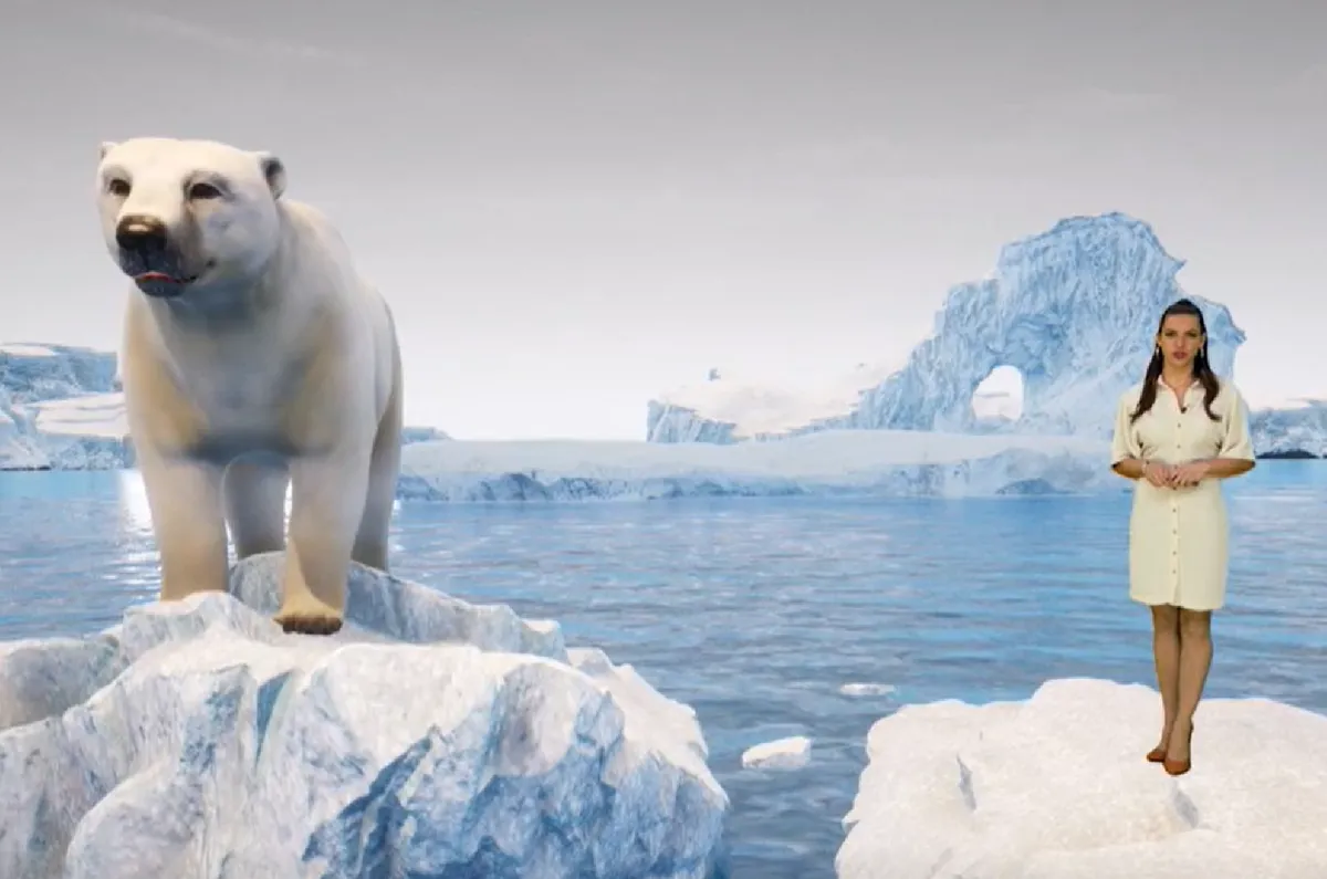 A közmédia idén tavasszal megújult időjárásjelentése nemcsak a várható időjárásról tájékoztatja a nézőket óráról órára, hanem nézői fotókat, valamint az egyes napokhoz köthető fontos eseményekhez kapcsolódó látványelemeket is bemutat. A Magyarországon egyedülálló technikai megoldásokat használó stúdióban most szombaton megelevenedik szemünk előtt az Északi-sark szomorú valósága: az olvadó jégtáblákon egyensúlyozó jegesmedve, mely állatfajt a klímaváltozás mostanra már szinte a kihalás szélére taszított.