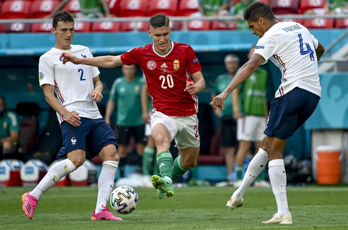 Az első 15 percben javarészt kirajzolódott, hogy a magyarok elsősorban a szabadrúgások kiharcolására játszanak, a francia térfél jobb oldaláról kétszer is végezhettek el pontrúgást, de ezekből nem alakult ki gólszerzési lehetőség. Az ellenfél 12 perc után vette át először a kezdeményezést, és rögtön két nagy helyzetet is kialakított: Benzema lövésénél Gulácsi védett szépen, Mbappé pedig nyolc méterről a bal oldali kapufa mellé fejelt. A 30. perchez közeledve ismét ők ketten puskáztak el két lehetőséget, Benzema ziccerben kapu mellé lőtt, Mbappé pedig borzasztó lövést eresztett el az ötös sarkáról, miután négy magyar védőt is kicselezett. A félidő végéhez közeledve még inkább erősödött a francia nyomás, a ráadás perceiben azonban Sallai és Fiola összjátékának végén utóbbi megszerezte a vezetést a magyaroknak, a gól után pedig felrobbant a hangorkán a Puskás Arénában.