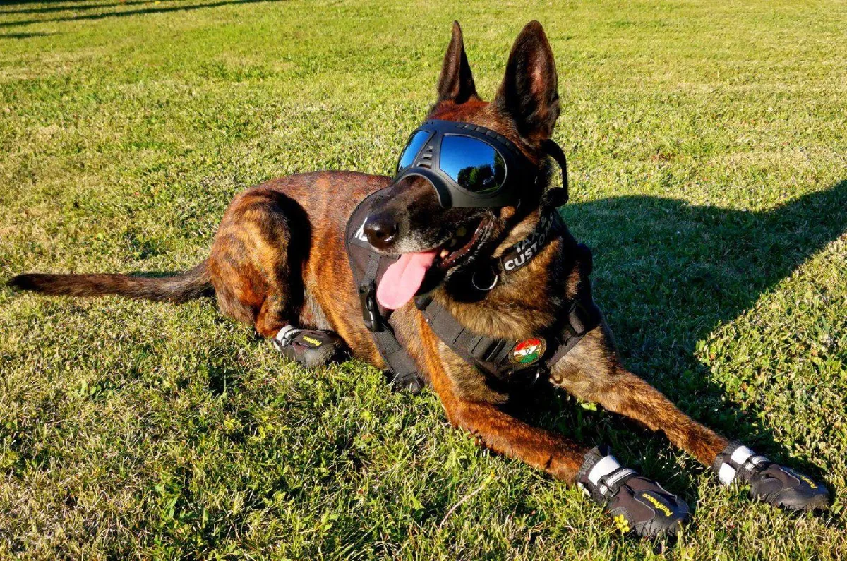 Amint az a fotókon is látható, a kutyus mancsvédő cipőket kapott, és, hogy ebben a nagy melegben ne süssön a nap a szemébe és ne zavarja ez a munkában, Thor még extra vagány napszemüveget is hord.