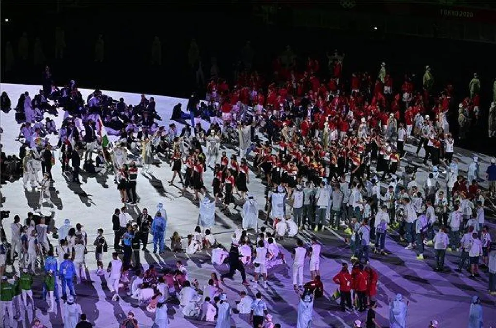 A sportolói bevonulást a hagyományokhoz hűen az ötkarikás játékok bölcsőjének számító Görögország versenyzői nyitották, a magyarok pedig a japán ABC alapján a 143. helyen érkeztek. A sort majd 206.-ként a házigazda japánok zárják. A sportolók jelentős része - vélhetően - a szigorú távolságtartási és maszkviselési szabályok miatt olyan megoldást választott, hogy a bevonuláson részt vett, utána viszont nem maradt a küzdőtéren, hanem azonnal kiment a stadionból. A tokiói olimpián 206 nemzet több mint 11 ezer versenyzője vesz részt.