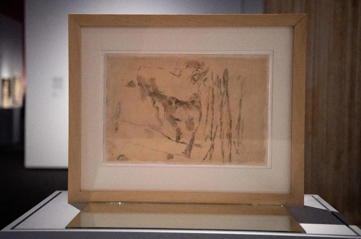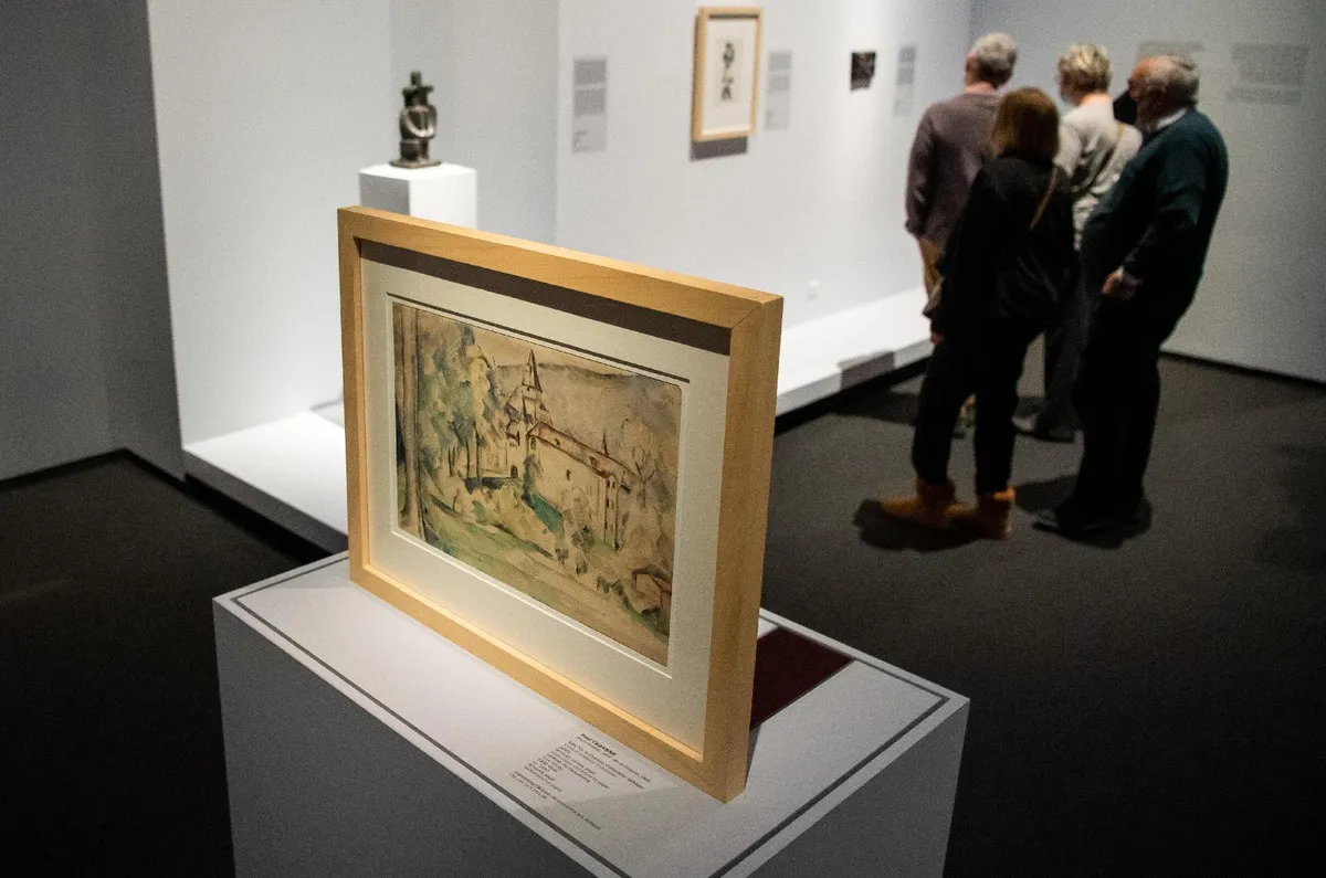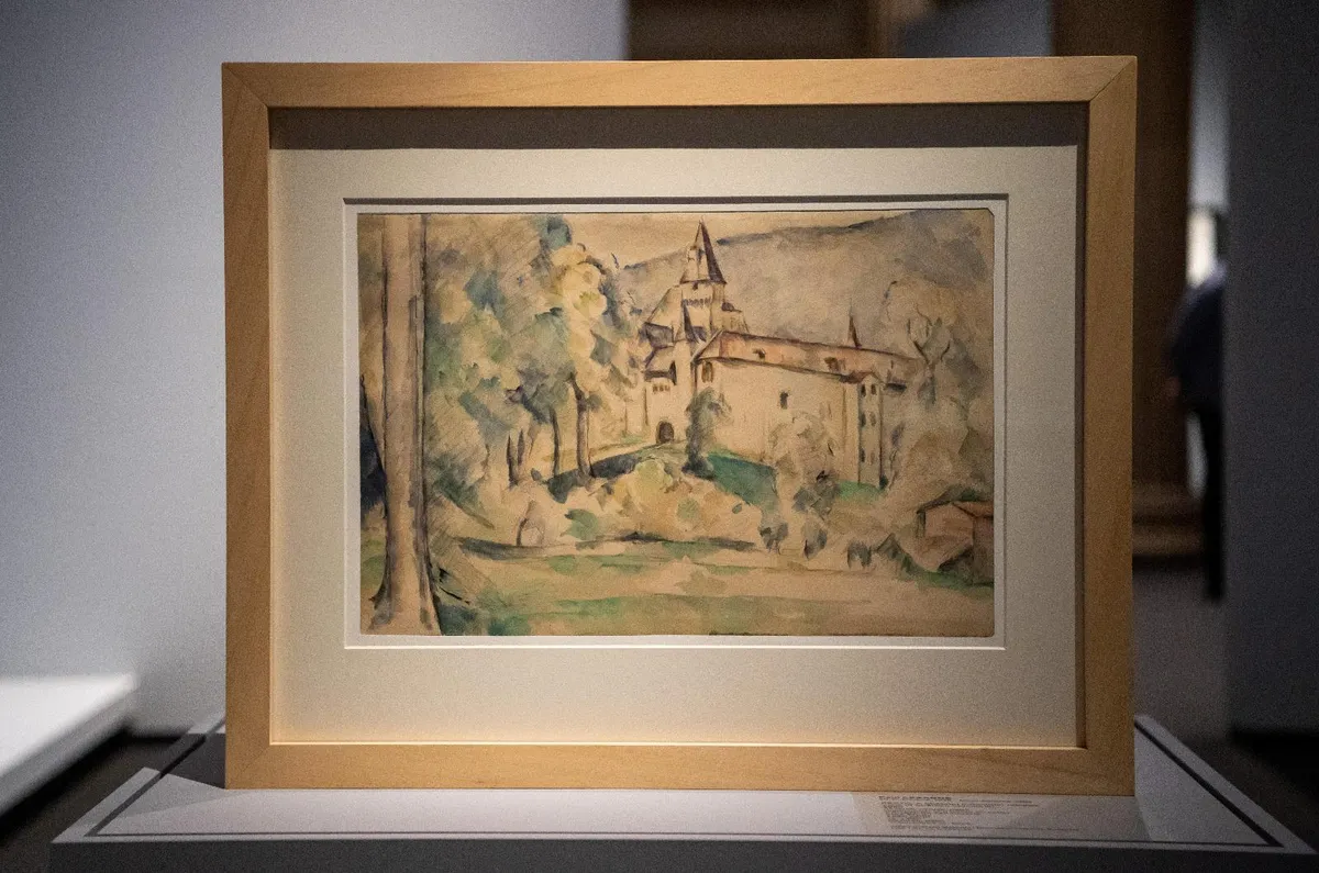 Geskó Judit, a Cezanne-tól Malevicsig című kiállítás kurátora elmondta, hogy a Cezanne-mű egyik oldalán található akvarell a Colombier-kastélyt ábrázolja távolnézetből. A képen a francia mester pályájának utolsó két évtizedére jellemző laza, foltokból építkező, a papírt néhol üresen hagyó oldottság mutatkozik meg."Ez a tájkép a cezanne-i életműben is rendkívül érdekes teljességet mutat" - emelte ki.