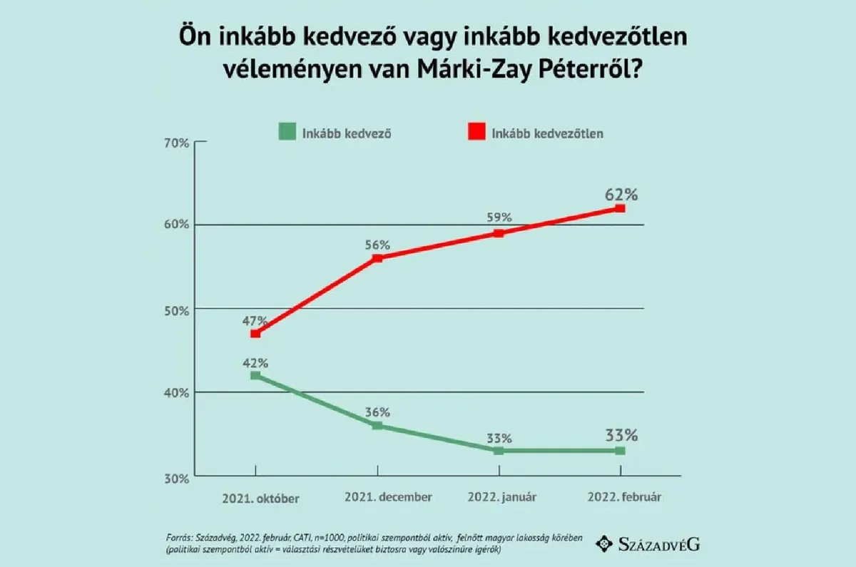 Ezzel párhuzamosan kijelenthető, hogy Márki-Zay nem tudott újabb választókat maga mellé állítani. A felmérés alapján elmondható ugyanis, hogy februárban – a 2022 januárjában mért adatokkal megegyezően – a megkérdezettek 33 százaléka nyilatkozott pozitívan a baloldali pártok miniszterelnök-jelöltjéről, holott 2021 októberében még a magyarok 42 százaléka szimpatizált vele.