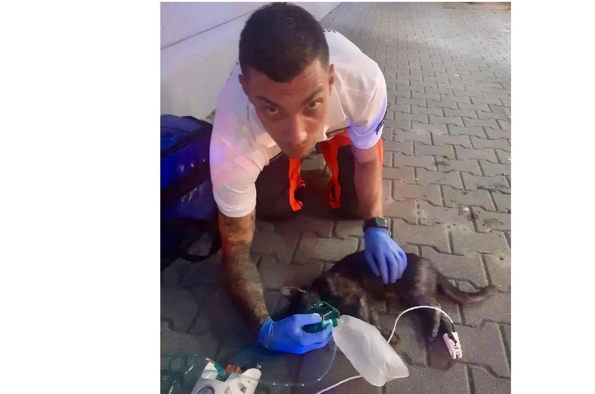 Egy tűzoltó szaladt ki az épületből karjaiban egy eszméletlen fekete macskával, akit azonnal átvettek az életmentők, majd megkezdték az ellátását.