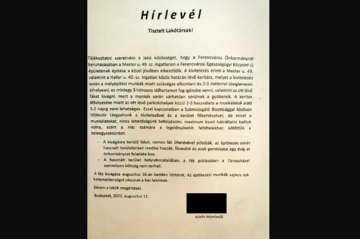 A nyilatkozó lakók kifejtették továbbá, hogy a közös képviselő az önkormányzattal, valamint a kivitelezőkkel történő egyeztetések során őket nem kérdezte meg, az első információt a fent említett, 2022. augusztus 11-én kelt hírlevélből tudták meg.