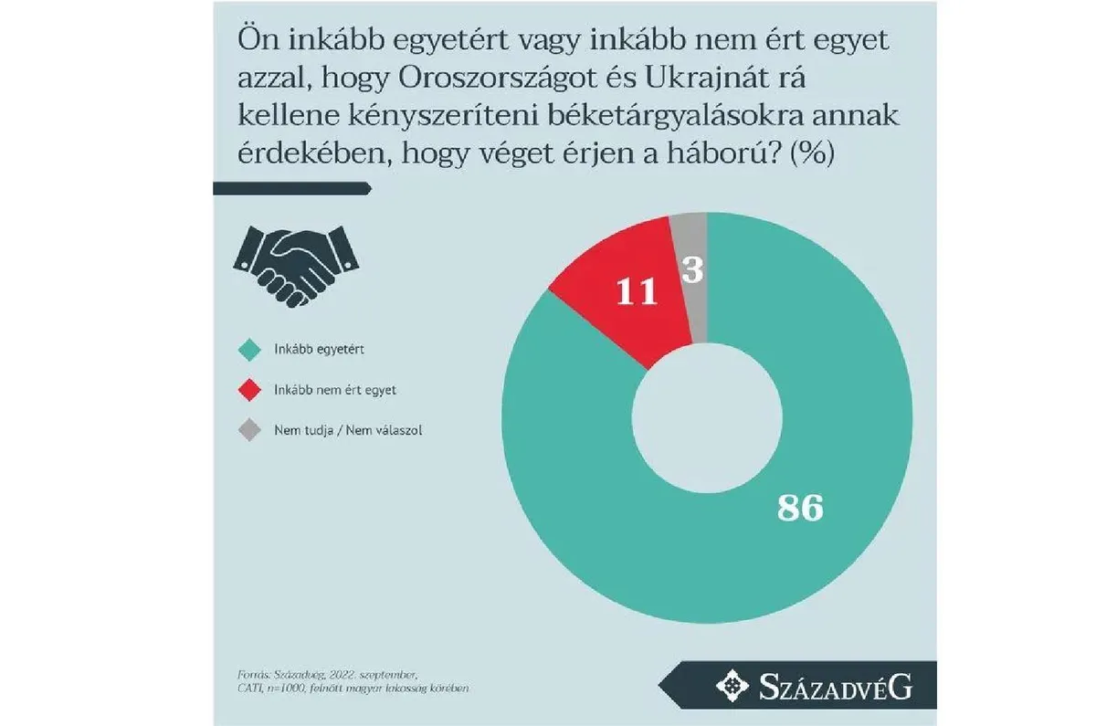 Ezzel szemben a Századvég kutatása rávilágít arra, hogy a magyarok több mint négyötöde (86 százaléka) egyetért azzal, hogy Oroszországot és Ukrajnát rá kellene kényszeríteni a béketárgyalásokra a háború mielőbbi lezárása érdekében.