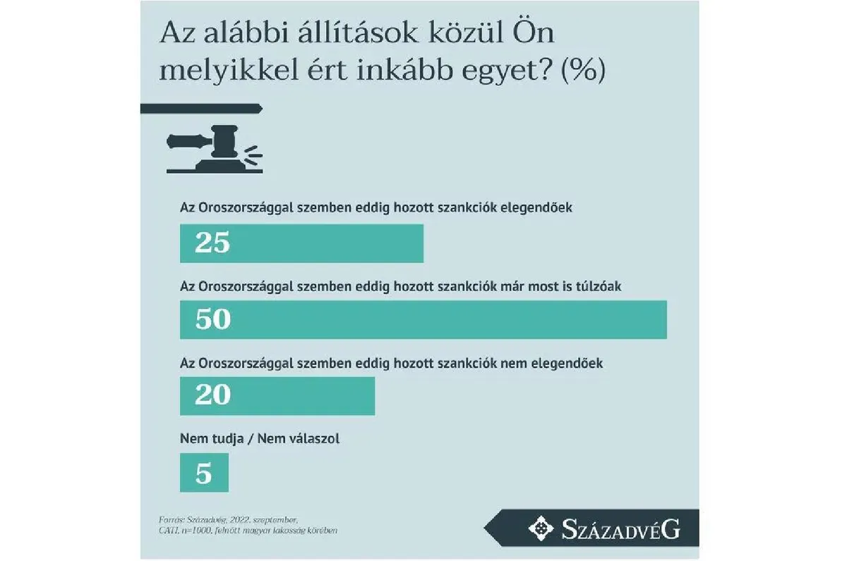A szankciók hatásosságával kapcsolatos aggályokat mutatja, hogy a magyarok fele (50 százaléka) úgy látja, hogy az Oroszországgal szemben az eddigiekben meghozott szankciók már most is túlzóak, míg a megkérdezettek negyede (25 százaléka) szerint a már bevezetett intézkedések elegendőek, nincs szükség újabb lépésekre.