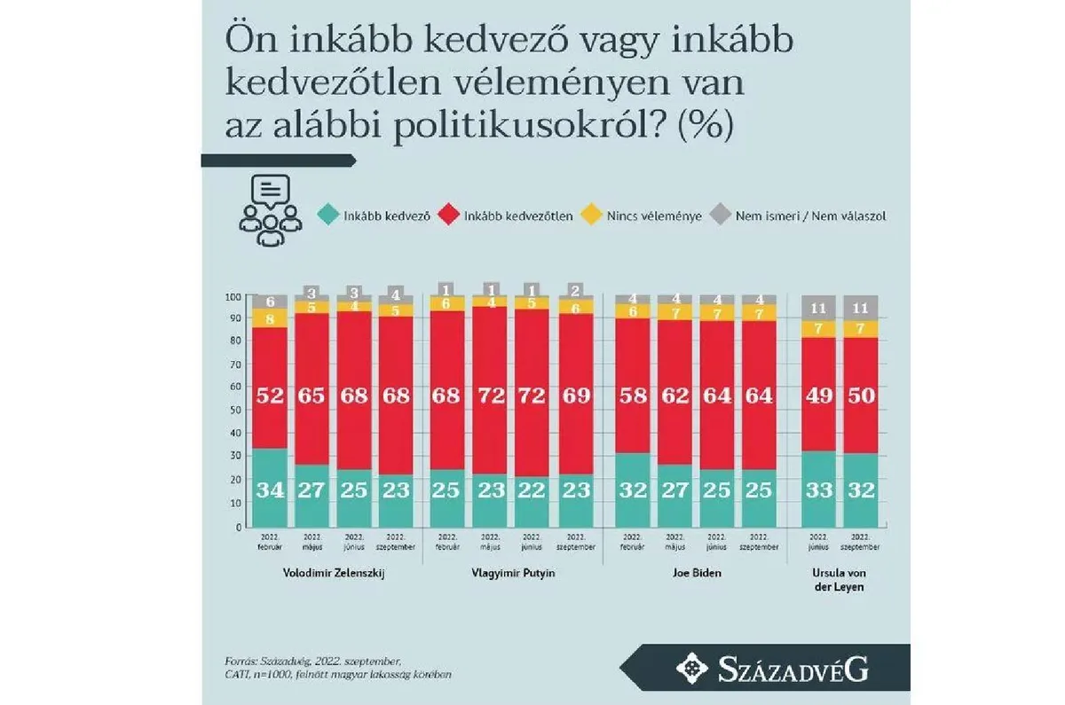 Joe Biden amerikai elnök, illetve Ursula von der Leyen, az Európai Bizottság elnökének megítélése júniushoz viszonyítva érdemben nem változott: szeptemberben Bidenről a megkérdezettek közel kétharmada (64 százaléka), von der Leyenről a válaszadók fele (50 százaléka) fogalmazott meg kedvezőtlen véleményt