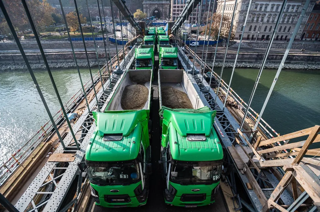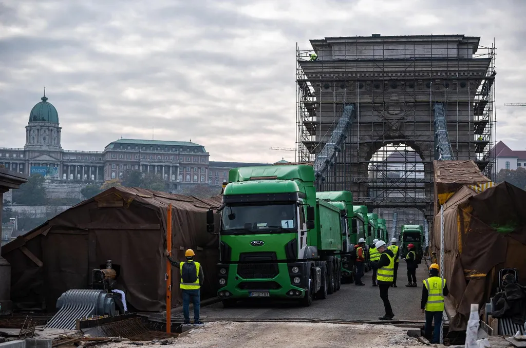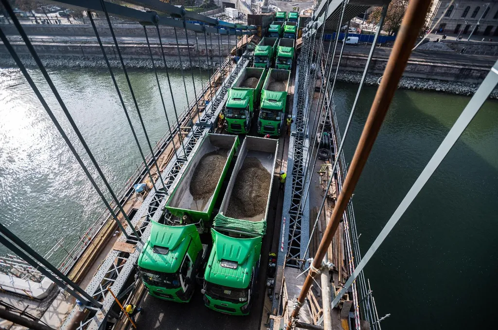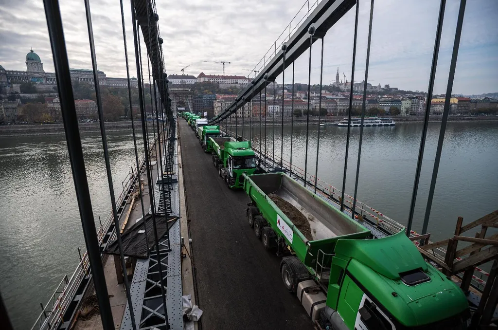 Számos teherautó foglalta el a Lánchidat a próbaterhelés alkalmából.