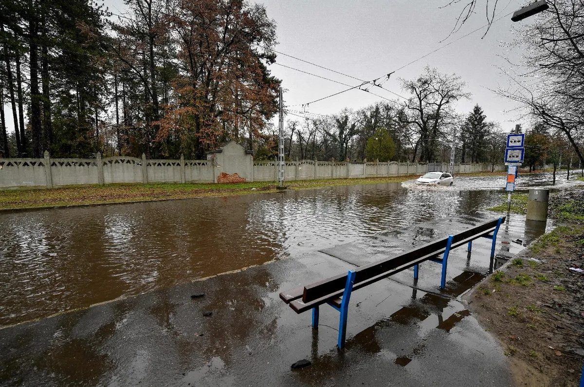 Egy jármű halad az összegyűlt csapadékvízben a Benczúr Gyula utcán Debrecenben 2022. december 11-én. Az Országos Katasztrófavédelmi Főigazgatóság közleménye szerint az erős szél és a sok csapadék miatt a tűzoltók segítségére volt szükség országszerte, fák dőltek ki, pincék teltek meg vízzel. MTI/Czeglédi Zsolt