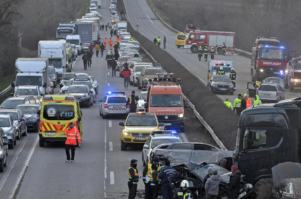 A sztrádán a Hegyeshalom felé vezető oldalon a 31-es kilométernél 5 kamion és 37 személyautó ütközött össze, egy ember meghalt, 39-en megsérültek, 19 jármű kigyulladt.