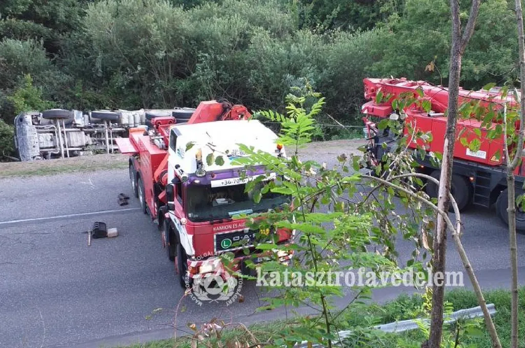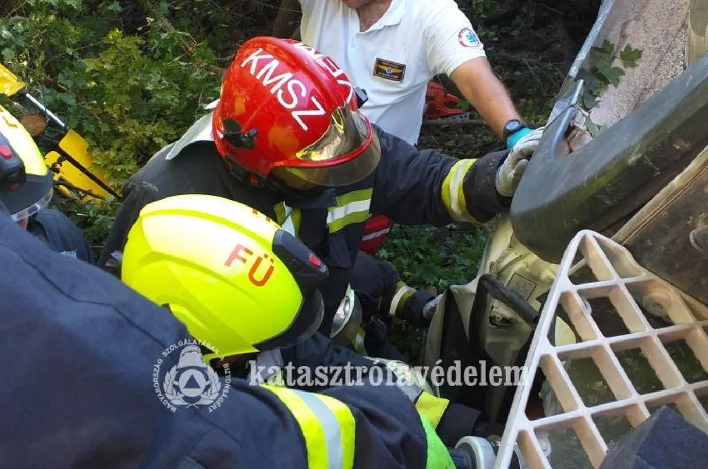 Egy betonkeverő teherautó eddig ismeretlen körülmények között az út menti patakmederbe borult, és a tetején állt meg. A sofőr beszorult a fülkébe, ezért a tűzoltók hidraulikus feszítővágó berendezéssel szabadították ki, majd súlyos sérülésekkel mentőhelikopter szállította kórházba.