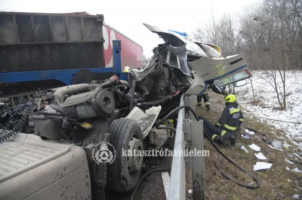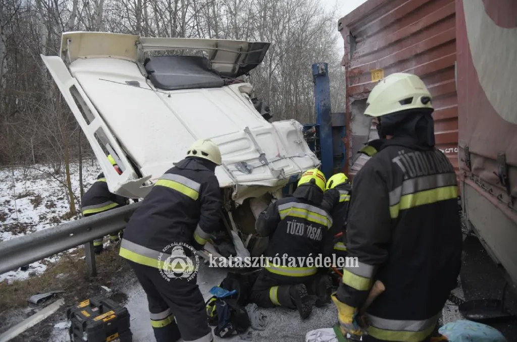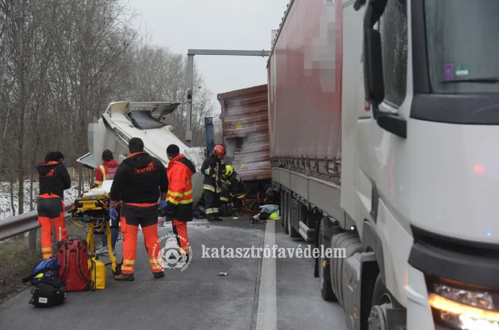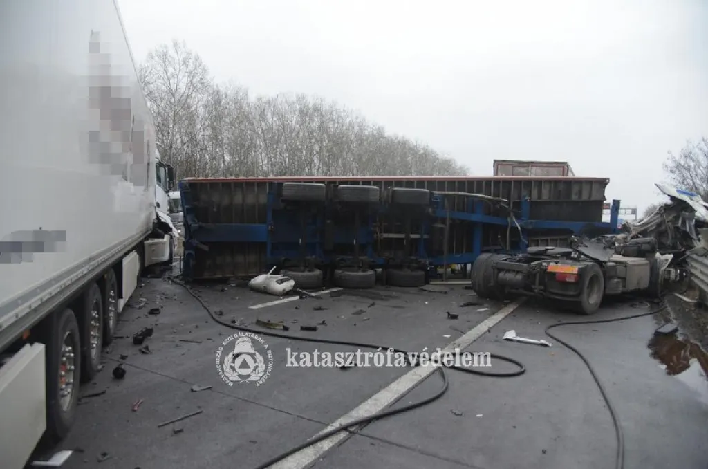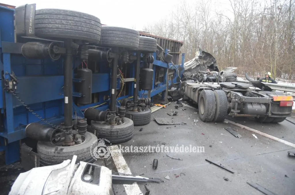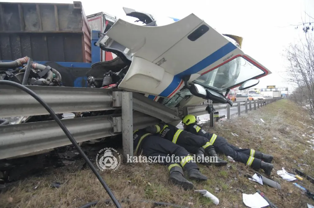 A gyorsforgalmi út 29-es kilométerszelvényénél, Budapest és Alsónémedi határában eddig ismeretlen körülmények között összeütközött három kamion. Óriási pusztítást végeztek a teherautók, az egyik felborult, vezetője pedig a fülkébe szorult.