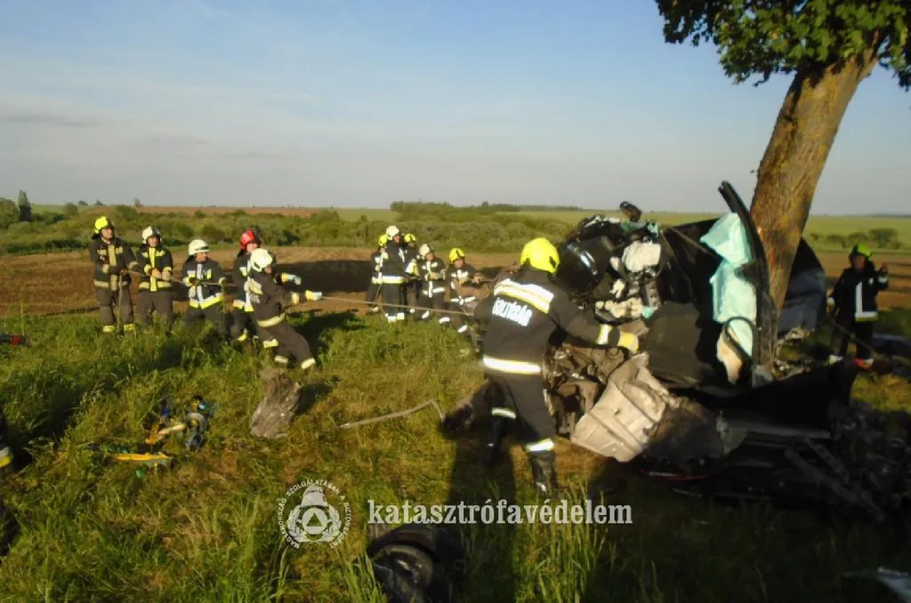 A baleset következtében az egyik kocsi az út melletti fának csapódott és az oldalán állt meg, két utasa az autóba szorult.