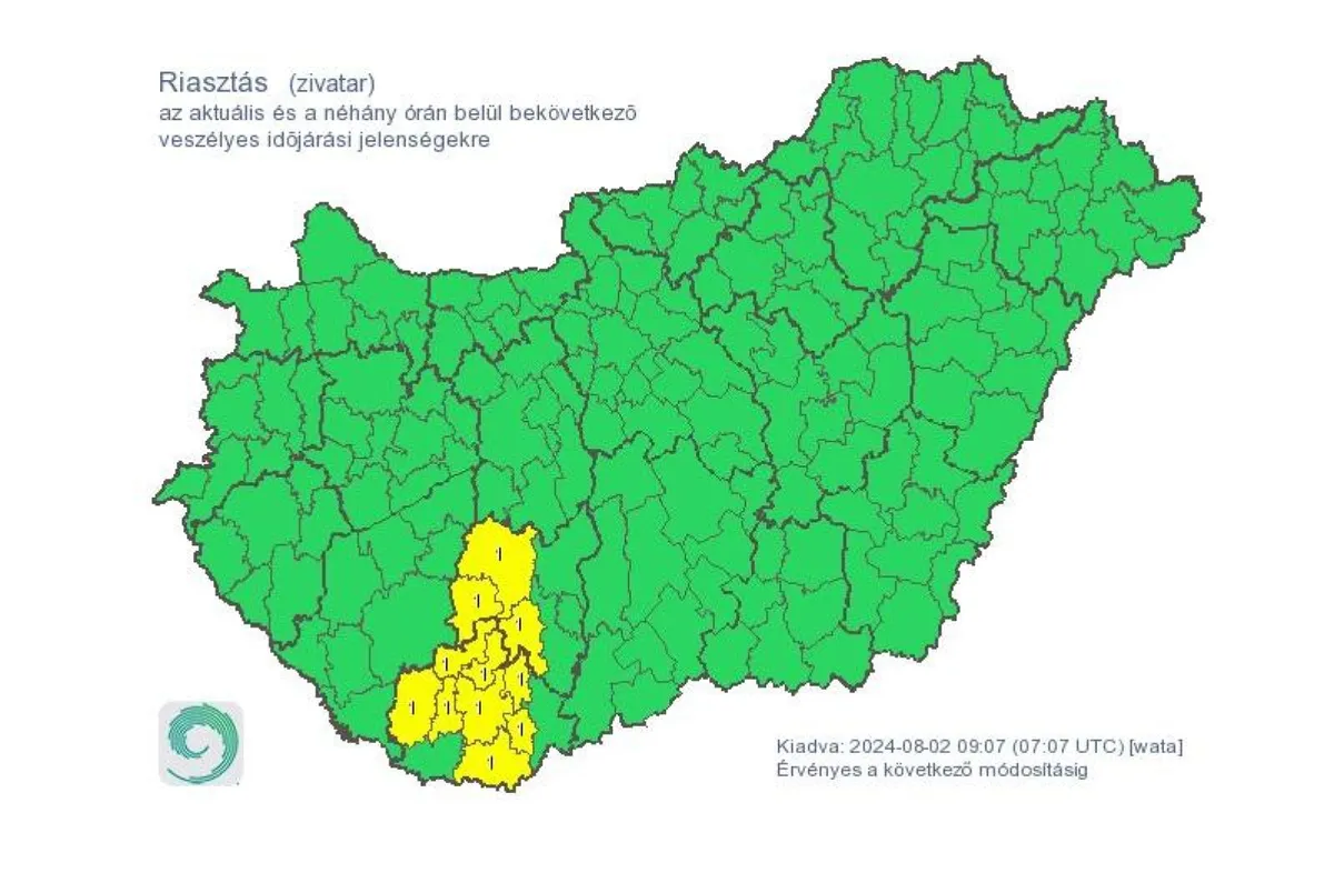 Szinte egész Baranya vármegyére, valamint Tolna vármegyében a Bonyhádi, a Dombóvári és a Tamási járásra elsőfokú riasztást adott ki a meteorológiai szolgálat.