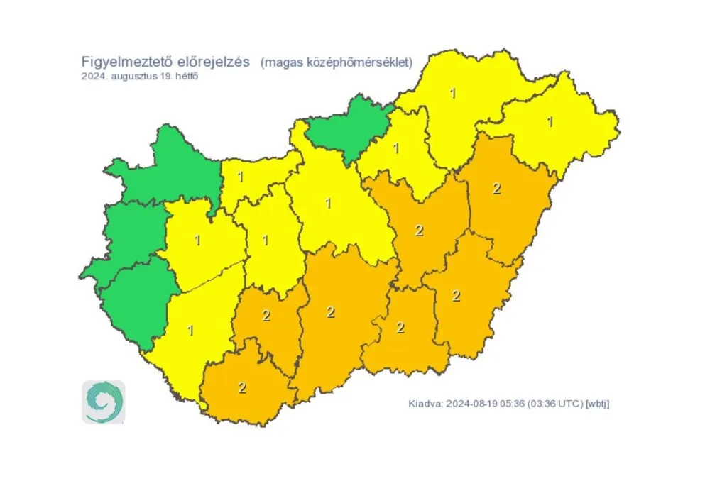 A kánikula ugyancsak szinte minden vidéket érint: Baranyában, Tolnában, Bács-Kiskunban, Csongrád-Csanádban, Jász-Nagykun-Szolnokban, Békésben és Hajdú-Biharban másodfokú, míg Somogy, Veszprém, Fejér, Komárom-Esztergom, Pest, Heves, Borsod-Abaúj-Zemplén, illetve Szabolcs-Szatmár-Bereg vármegyében elsőfokú figyelmeztetést rendeltek el.
