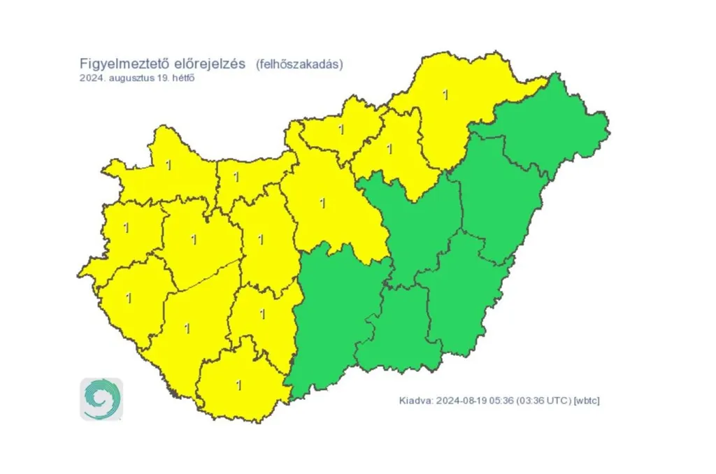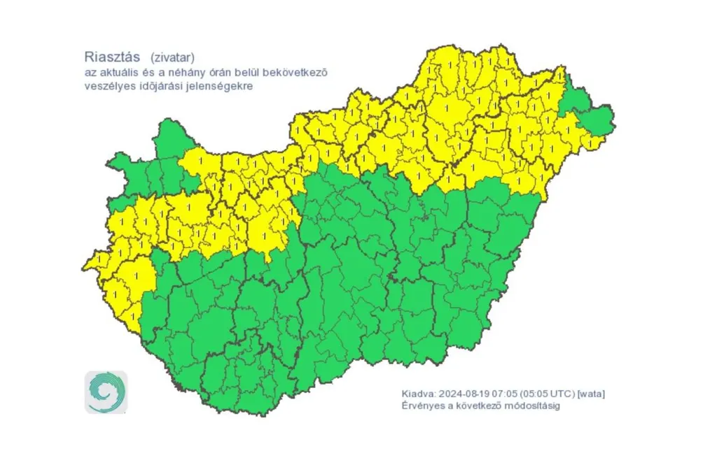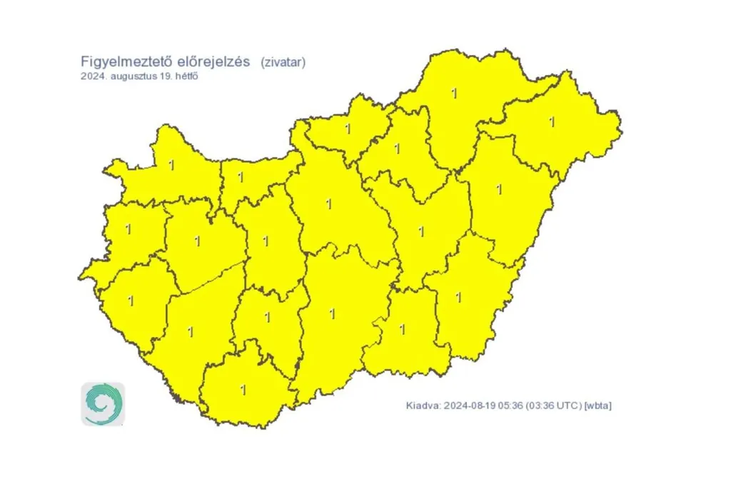 A meteorológia szolgálat zivatar miatt elsőfokú riasztást adott ki Zala, Vas, Veszprém, Győr-Moson-Sopron, Komárom-Esztergom, Fejér, Pest, Nógrád, Heves, Borsod-Abaúj-Zemplén, Szabolcs-Szatmár-Bereg és Hajdú-Bihar vármegye számos járására, legalacsonyabb szintű figyelmeztetésük azonban a teljes országra érvényes.