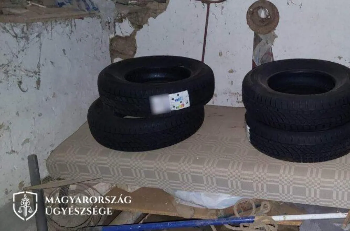A fényképet a Siófoki Rendőrkapitányság készítette az egyik vádlottnál végrehajtott kutatás alkalmával lefoglalt gumiabroncsokról.