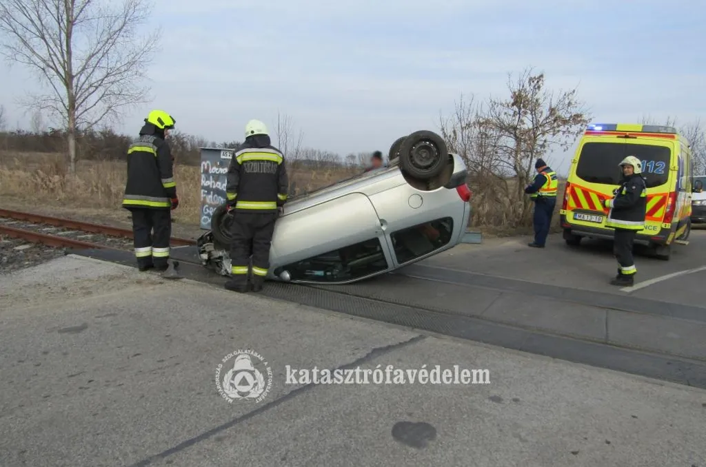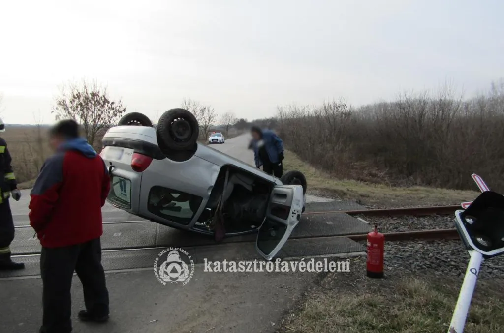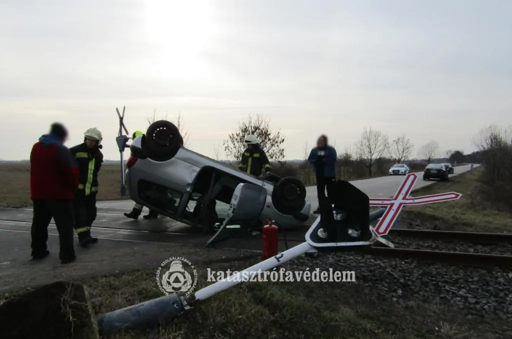 A kocsi szerdán délután rejtélyes körülmények között lenullázott egy fénysorompót, a tetejére borult, majd a sínek kellős közepén állt meg – derül ki a Jász-Nagykun-Szolnok vármegyei katasztrófavédelem beszámolójából.