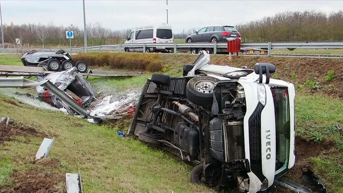 A sofőr egy autót szállított a kisteherautóval, amihez még egy trélert is hozzákapcsolt, ezen két további kocsi volt. Valószínű tehát, hogy a túlsúlyos szállítmány miatt történt a baleset. A kisteherautó először a belső szalagkorlátnak csapódott, majd irányíthatatlanul sodródva átszakította a külső szalagkorlátot és árokba borult. A sofőr nem sérült meg a balesetben, a műszaki mentés azonban órákig tartott.