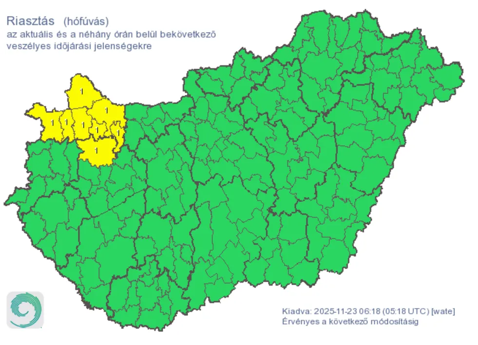 Vasárnap sárga figyelmeztetés van érvényben, ugyanis Észak-Dunántúlon a késő délelőtti, déli órákig gyenge hófúvás még előfordulhat, és az északi tájakon a gyenge hóesés akár még egy centiméterrel is növelheti az eddigi hótakarót. A hőmérséklet csúcsértéke -2 és +4 fok között valószínű. Késő estére általában -5 és +1 közé hűl le a levegő, de a hóval borított tájakon ennél hidegebb is előfordulhat.
