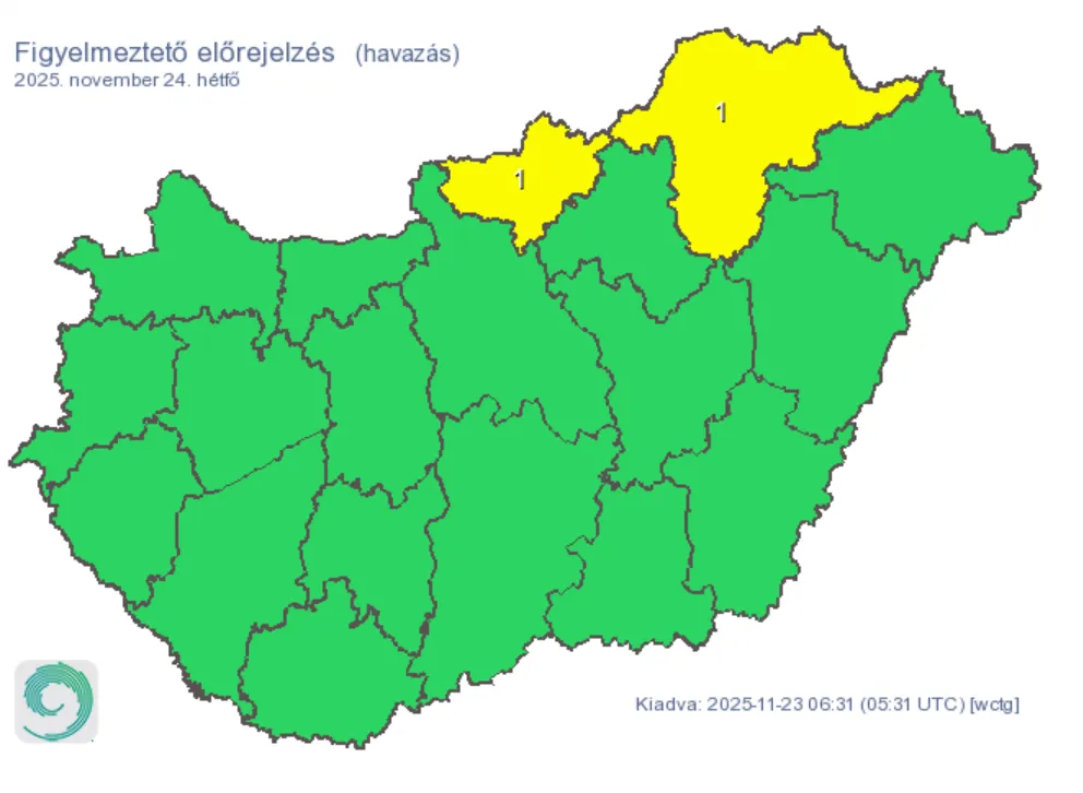 Hétfőn még gyönyörködhetünk a hófehér tájban, ám Heves vármegyében ónos eső, Borsod-Abaúj-Zemplén vármegyében, és Nógrád vármegyében pedig az ónós eső mellett 12 óra alatt öt centimétert meghaladó friss hó is hullhat. Kora délután általában 2 és 8 fok között alakul a hőmérséklet, de északkeleten fagypont körül alakulhat a maximum.