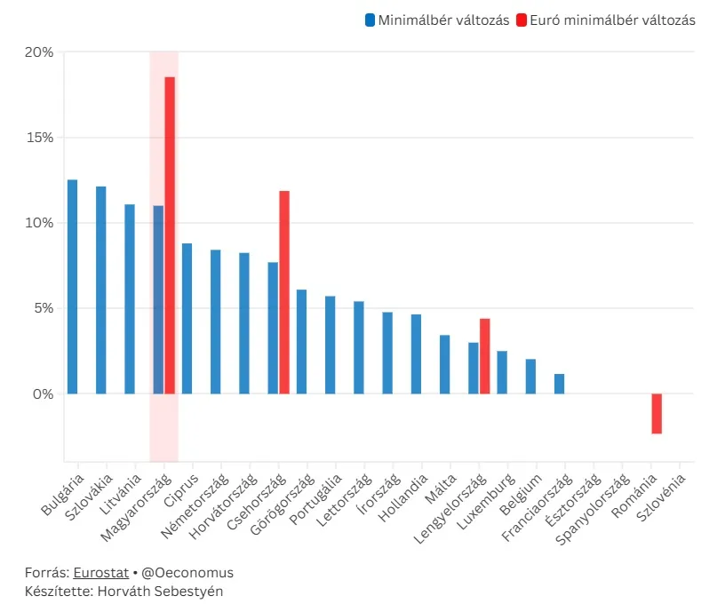 Évek óta a minimálbér bővülési üteme közel egybevág az éves átlagos keresetnövekedéssel, így egyfajta referenciapontként szolgál – írja elemzésében az Oeconomus. Ez alapján a legalacsonyabb fizetések idei változási üteméből következtetni lehet a teljes bérdinamikára. A forintárfolyam 7-9 százalékos erősödése és a 11 százalékos minimálbér-növelés hatására euróban számítva éves alapon hazánkban nőtt a legnagyobb mértékben a legalacsonyabb keresetűek fizetése, közel 19 százalékkal.