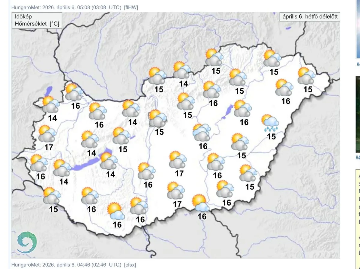 Morcos időjárással indult a húsvéthétfő. Délelőtt északon, északkeleten kialakulhat zápor, ezt követően már legfeljebb csak nyugaton, délnyugaton lehet kevés helyen jelentéktelen csepergés, gyenge eső. Sőt, csökken a felhőzet, így a fátyol- és gomolyfelhők mellett többnyire sok napsütésre lehet számítani.