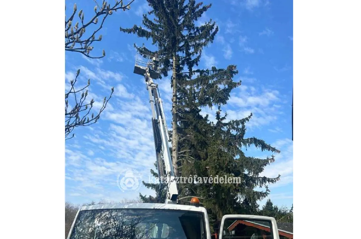 Egy férfi ugyanis tizenhárom méter magasságban, egy emelőkosaras jármű darujában ragadt miközben egy nagy méretű fenyő gallyazását végezte.