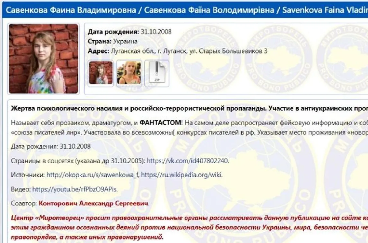 A mindössze 14 éves Faina Szavenkovát a Mirotvorec nevű ukrán oldal azzal vádolja, hogy a szakadár (LDNR) köztársaságok írószövetségének tagjaként prózaírói, dramaturgiai és esszéírói tevékenységnek álcázott ukránellenes propagandát folytat, álhíreket terjeszt az ukrán hadseregről és mindenféle oroszországi írópályázatokon vesz részt. Ezért a szervezet feltette a halállistájára a lányt – írta meg a Kárpát.in.ua.