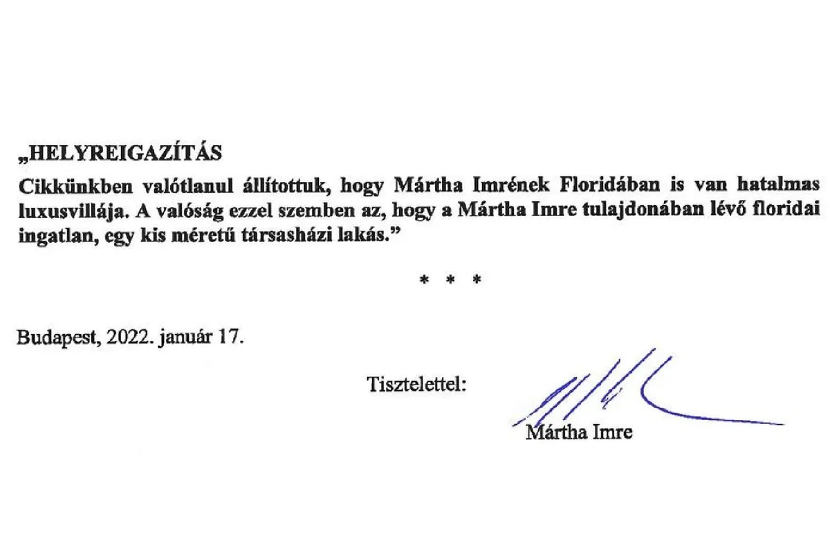 Az ügyvédje által írt levélben Mártha Imre azt egyáltalán nem tagadta, hogy több, milliárdokat érő ingatlant is vett magának Floridában, – például egy magánszigeten, a Mexikói-öböl kijáratánál egy hatalmas építési területet, – csak hát, szerinte az egyik floridai ingatlan mindössze egy „kisméretű társasházi lakás” Naples városában.