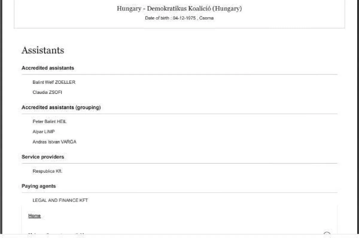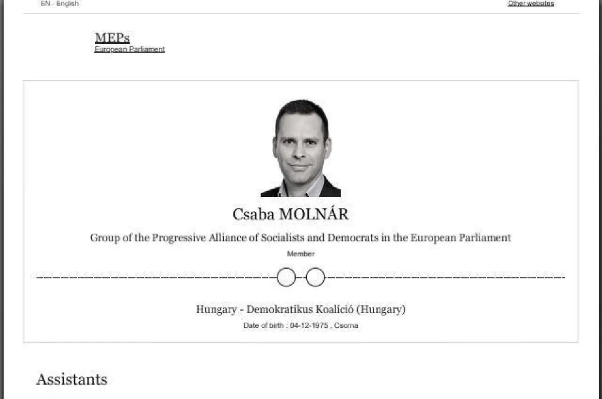 Jól látható Molnár Csaba hivatalos brüsszeli adatlapján is az utolsó sorban a pénzügyeit intéző Legal and Finance kft. neve a borsodi kis faluból.