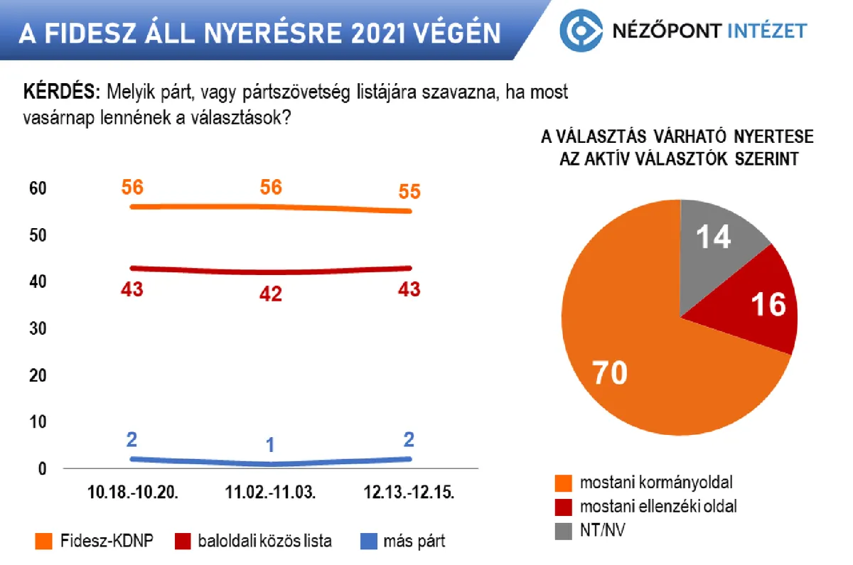 A több mint két hónapja tartó kampányával Márki-Zay Péter nem tudott fordítani a pártpreferencia trendeken. Egy „most vasárnap” tartott választáson a pártot választani tudók 55 százaléka szavazna a kormányoldalra és 43 százalékuk az ellenzéki közös listára. A Fidesz, valódi néppártként, szinte minden társadalmi csoportban megelőzi a baloldalt. Fellegvárainak számít a nyugdíjas társadalom és a községekben élők csoportja, ahol a válaszadók kétharmada kormánypárti szavazó. Budapest azonban kivételt jelent ez alól, a főváros politikai szempontból elszakad az ország többi részétől, itt ugyanis a baloldal áll 59, míg a jobboldal 39 százalékon.