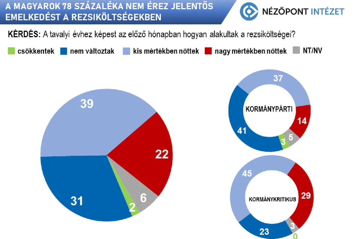 Arra a kérdésre, hogy a „tavalyi évhez képest az előző hónapban hogyan alakultak a rezsiköltségei” decemberben a magyar választóknak a 33 százaléka azt jelezte, hogy nem történt változás (illetve 2 százalékuknál egyenesen csökkent a kiadási tétel összege), további 39 százaléknak pedig csak „kis mértékben nőtt”. Mindössze a magyar választók ötöde (22 százalék) számolt be jelentős növekedésről. A megkérdezettek 6 százaléka pedig nem tudott felelni a kérdésre. Ezek alapján elmondható, hogy decemberben a magyarok 78 százaléka nem, vagy csak kismértékben érezte a rezsiköltségeinek emelkedését az előző évhez képest. Mindez a kormány rezsicsökkentést védő intézkedéseinek sikerét mutatja.