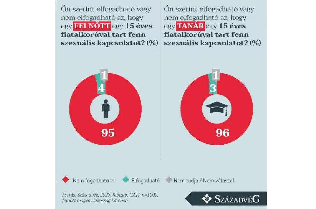 A magyarok 95 százaléka nem tartja elfogadhatónak, hogy egy felnőtt egy 15 éves fiatalkorúval tartson fenn szexuális kapcsolatot, továbbá 96 százalékuk ellenzi, hogy egy tanár egy rá bízott fiatalkorúval álljon ilyen kapcsolatban - írták.