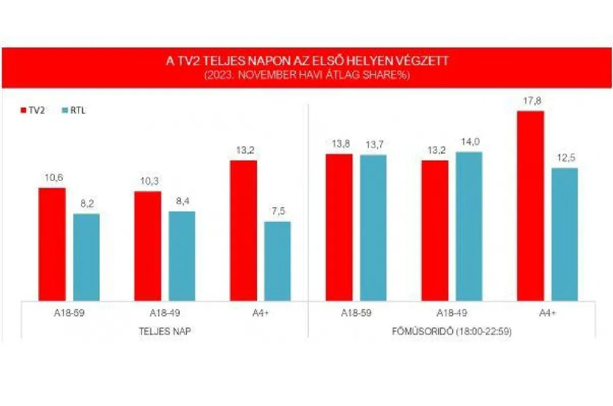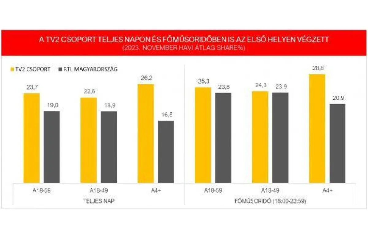 Az év 11. hónapjában teljes napon és főműsoridőben is első helyen végzett a TV2 Csoport mindhárom kiemelt korcsoportban (A18-59, A18-49, A4+). A TV2 főműsoridőben a háromból két korcsoportban, a 18-59 éves nézők és a teljes lakosság tekintetében szintén piacvezető novemberben. Az egész éves átlagot nézve továbbra is első helyen a TV2 és a TV2 Csoport is mindhárom kiemelt korcsoportban, teljes napon és főműsoridőben egyaránt. A június kivételével eddig az év minden hónapjában, vagyis 10:1 arányban a TV2 vezeti a nézettségi versenyt főműsoridőben a 18-59 évesek körében.