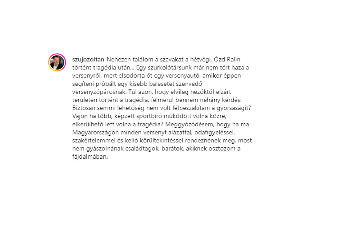 Szujó Zoltán is kifejtette a véleményét a hétvégi végzetes ralibalesetről egy Instagram-bejegyzésben.