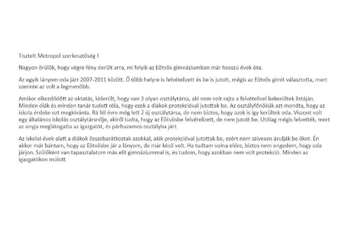 Ezt erősítette meg ez az újabb, a Metropolhoz írt levél is. Az édesanya gyermeke még 2007 és 2011 között járt az intézménybe, de már ekkor nyílt titok volt, hogy van az az összeg, amiért a felvételt nem nyert gyerekek is bekerülhetnek a budapesti elit gimnáziumba. Ráadásul nem is kevesen, csak az édesanya által említett egyetlen osztályban három protekciós gyermek volt, egy negyediket pedig a velük párhuzamos osztályba irányítottak.
