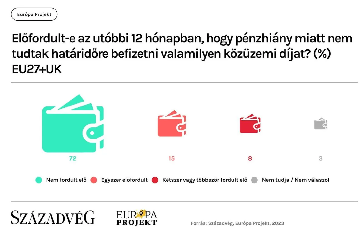 Az eredmények a közüzemi díjelmaradások esetében is hasonlóan aggasztó képet festenek; az elmúlt egy évben az uniós polgárok 15 százalékával egy, 8 százalékával több alkalommal fordult elő, hogy pénzhiány miatt nem tudta határidőre befizetni számláit.