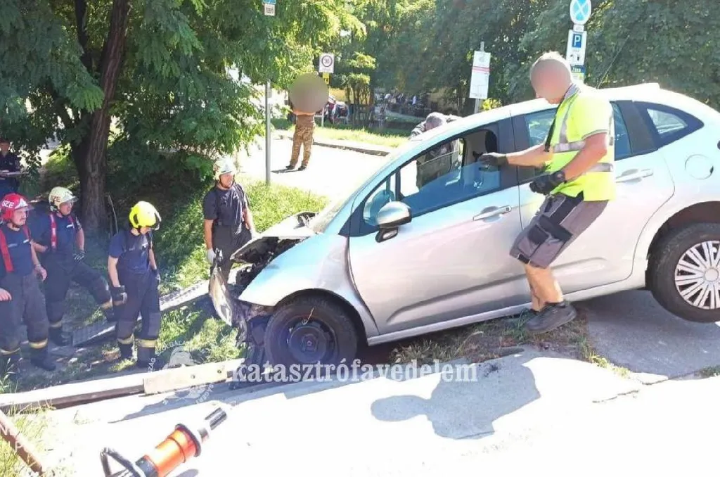 A kiérkező szentendrei tűzoltók rögzítették, áramtalanították és átvizsgálták a lerombolt orrú Citroent.