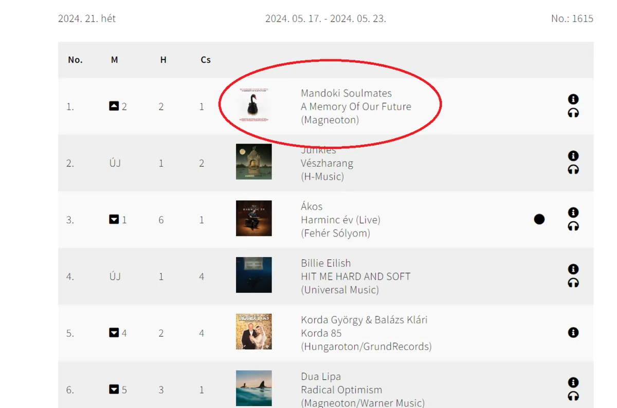 Valamivel több mint két héttel világszintű debütálása után csütörtökre berobbant hazánkban is a fizikai hanghordozók Top 40-es slágerlistájának élére a Mandoki Soulmates „A Memory Of Our Future” című albuma, ami nem csak hazánkban, de nemzetközileg is óriási sikert aratott. Ahogy arról korábban beszámoltunk, a szakma és azok a zenei kritikusok, akiknek már volt szerencséjük meghallgatni az új albumot, egyöntetűen pozitívan fogadták és felemelő cikkekben ünneplik a „Memory Of Our Future” című, új kiadványt, méltatva annak zenei gazdagságát és művészi mélységeit a prog-rock hazájában, Angliában, és a fusion jazz kiemelkedő területein is: az Amerikai Egyesült Államokban.